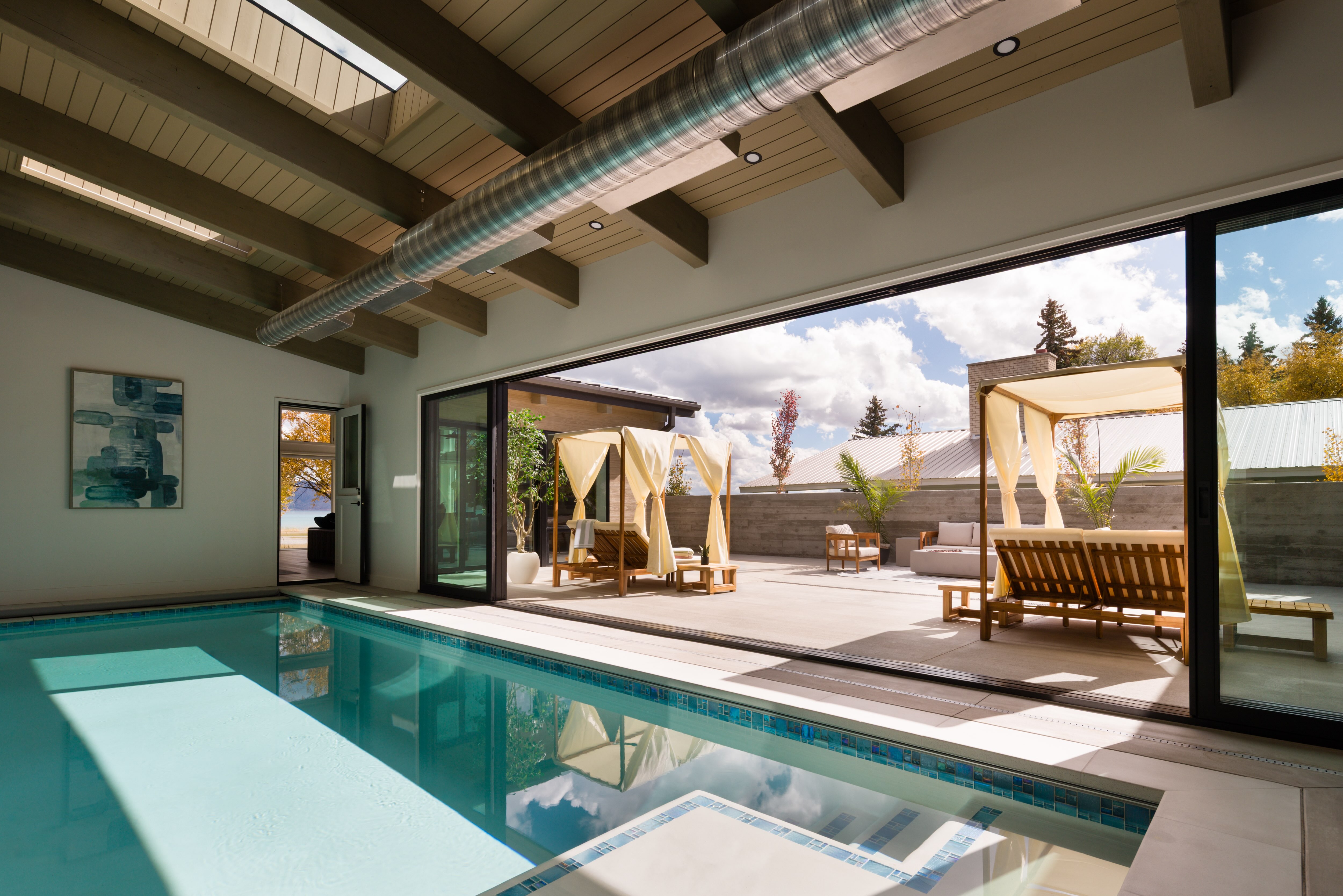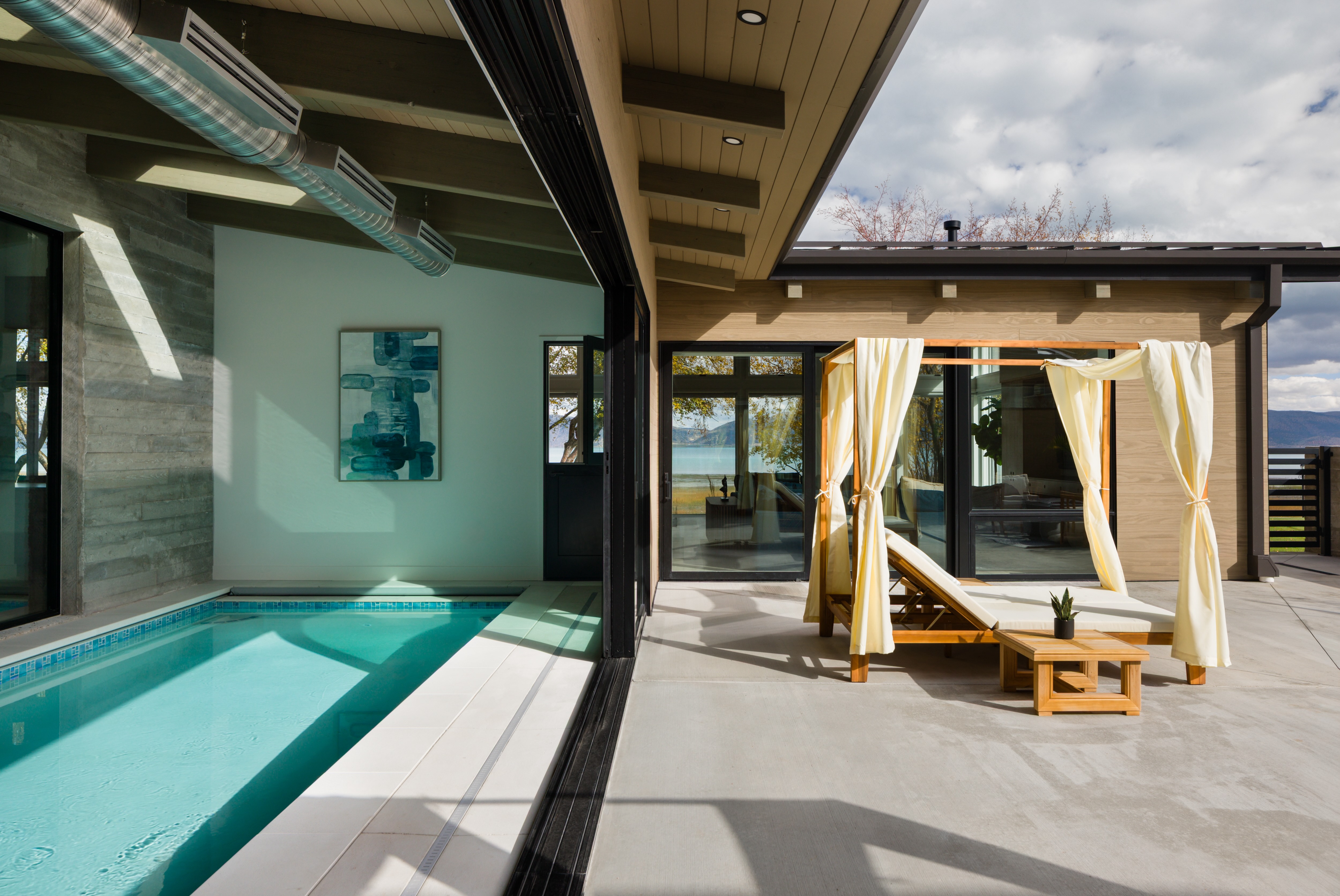 Indoor and outdoor living spaces are carefully blended together through the use of expansive windows and doors.