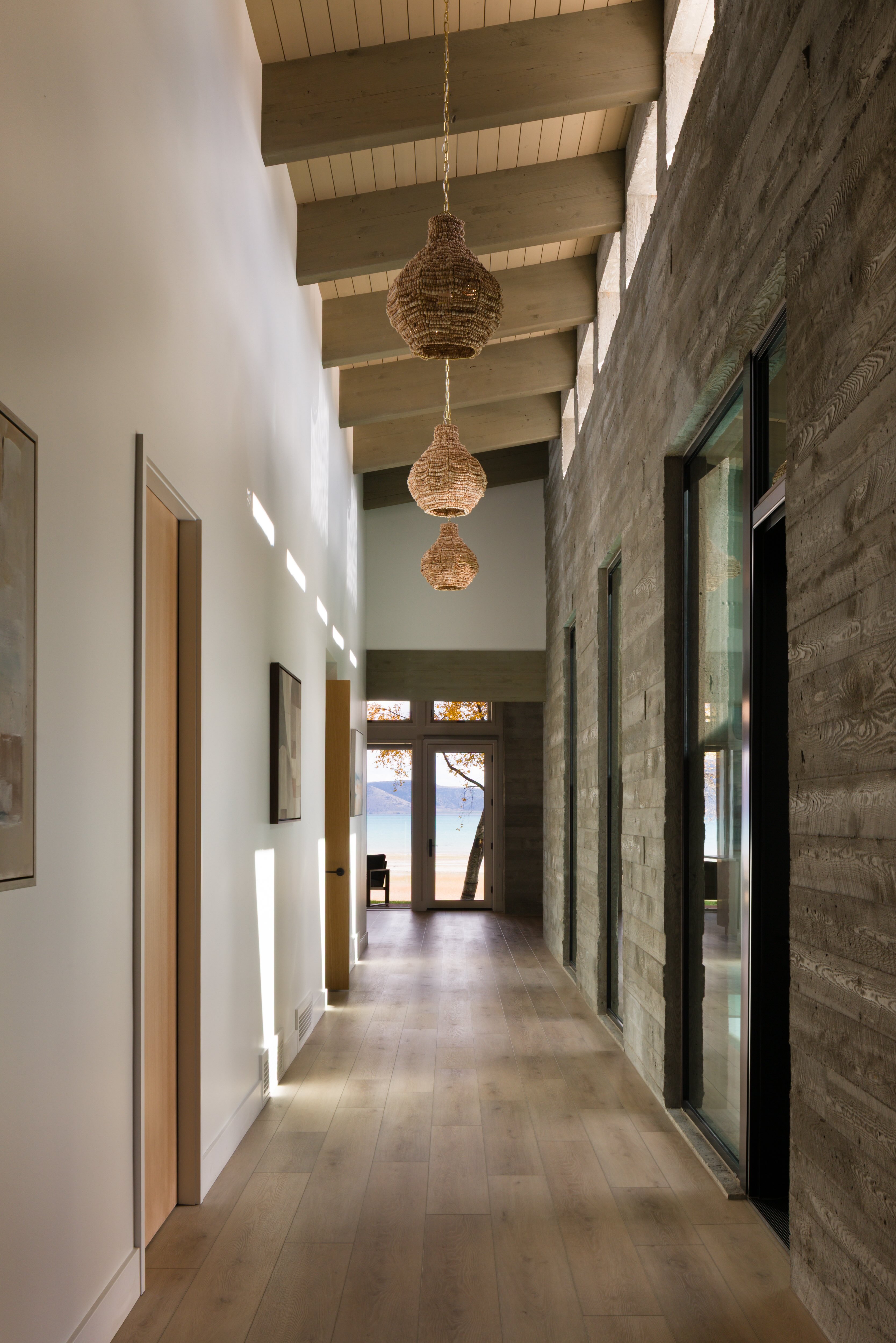The absence of drywall and paint throughout the entire structure enhances the elemental experience.