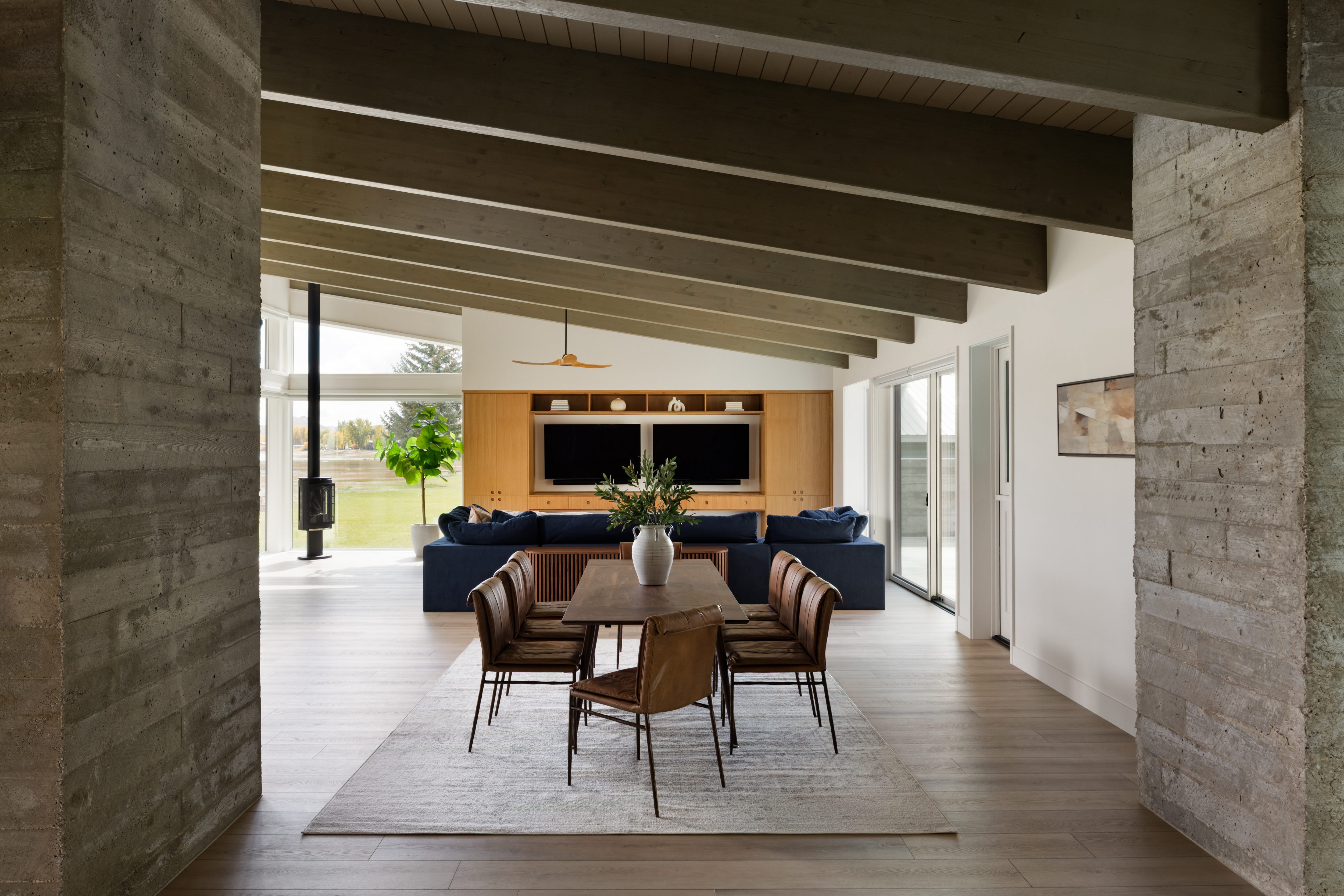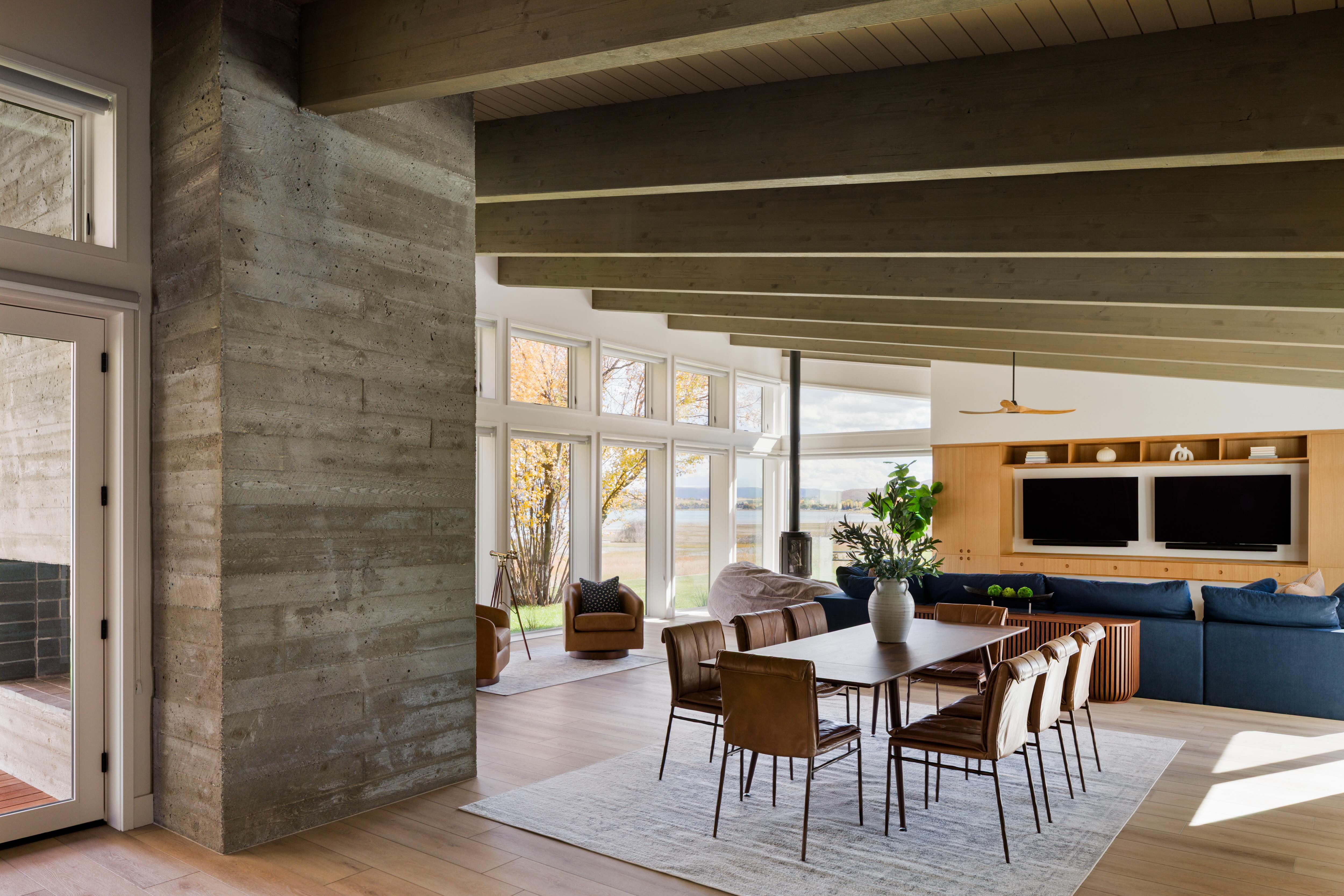 We leaned on exposed raw materials that could handle the often-harsh Utah weather, including elements like fieldstone walls, exposed beams and concrete-slab flooring.