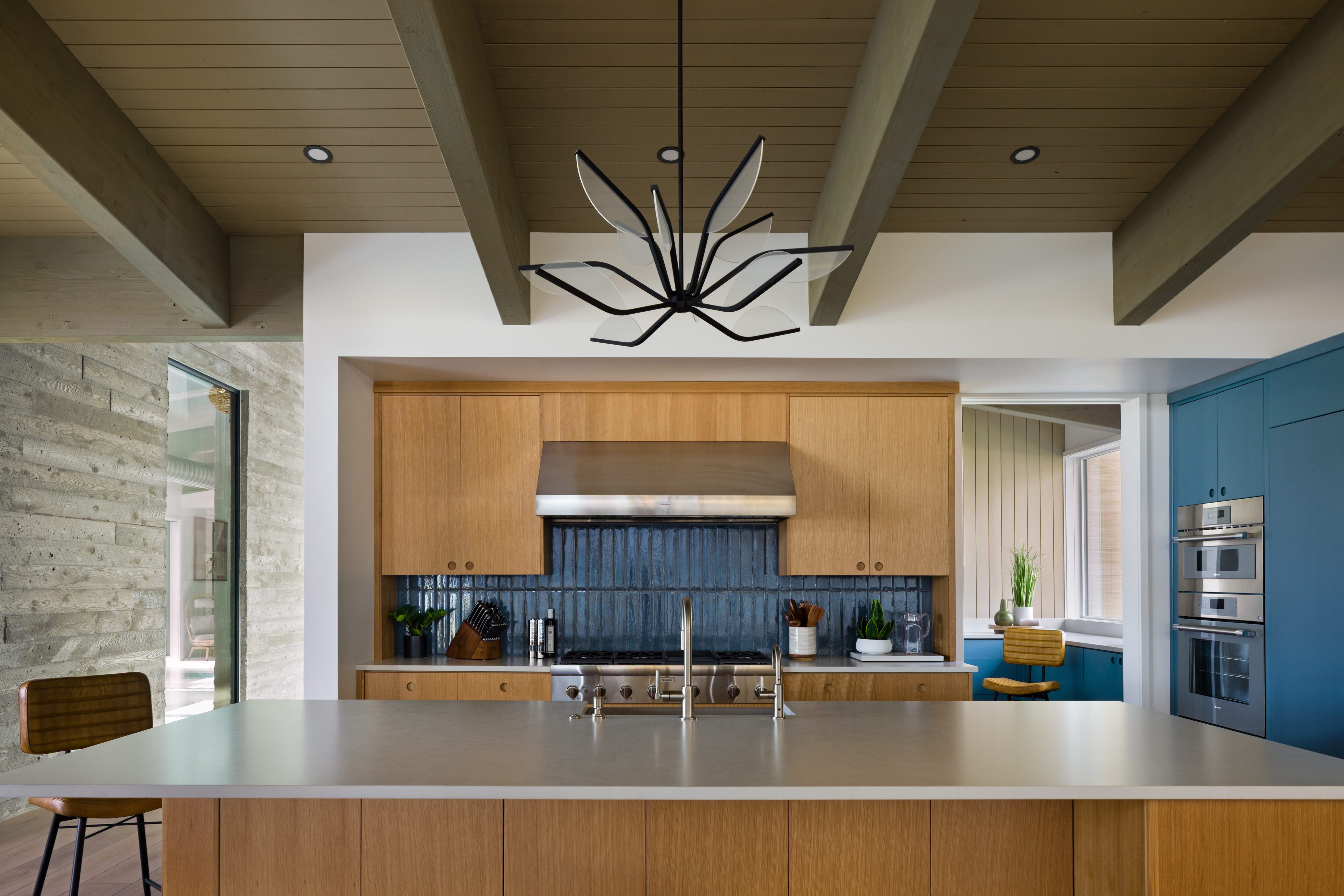 The kitchen is the functional heart of the home, and the circulation is organized to comfortably pass through the kitchen from several parts of the house and pool terrace.