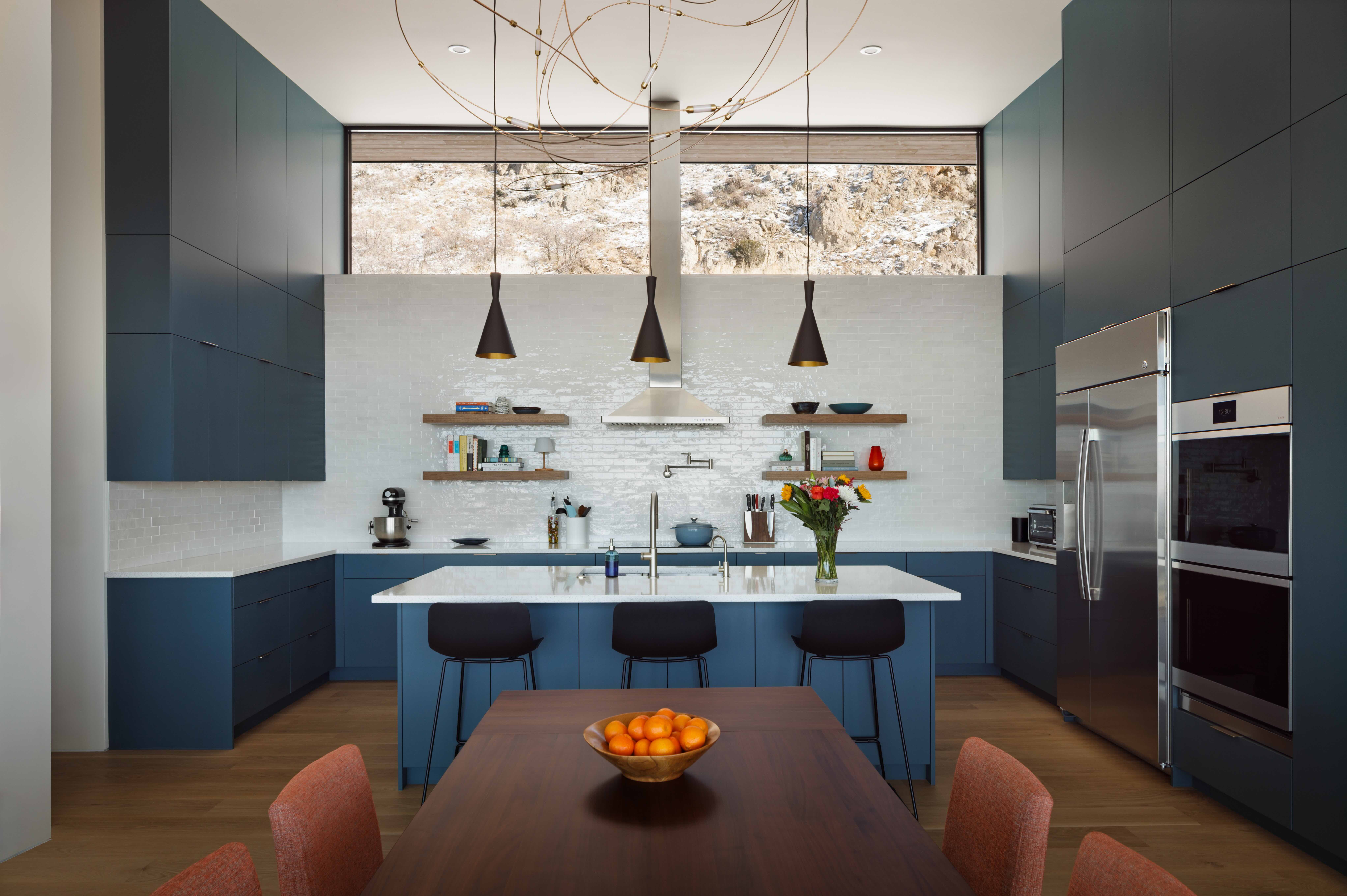 The kitchen is the functional heart of the home, and the circulation is organized to comfortably pass through the kitchen from several parts of the house and pool terrace.